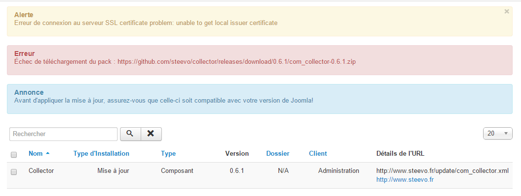 Comme fichier est hébergé sur github, il a besoin de pouvoir l'atteindre en https pour faire la mise à jour mais ton serveur ne doit pas avoir les ports ouverts pour pouvoir réaliser cette connexion. Tu auras le même problème avec toutes les extensions hébergées sur github (je n'ai aucune idée si cela représente une grosse part des extensions).